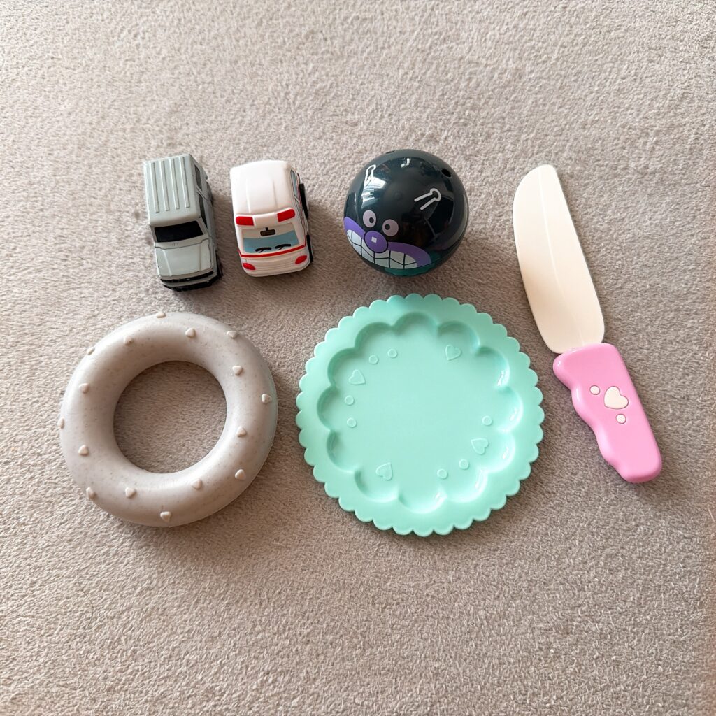 私は、保湿や着替えがさせやすいように、誤飲の心配がない小さめのおもちゃを使っています。